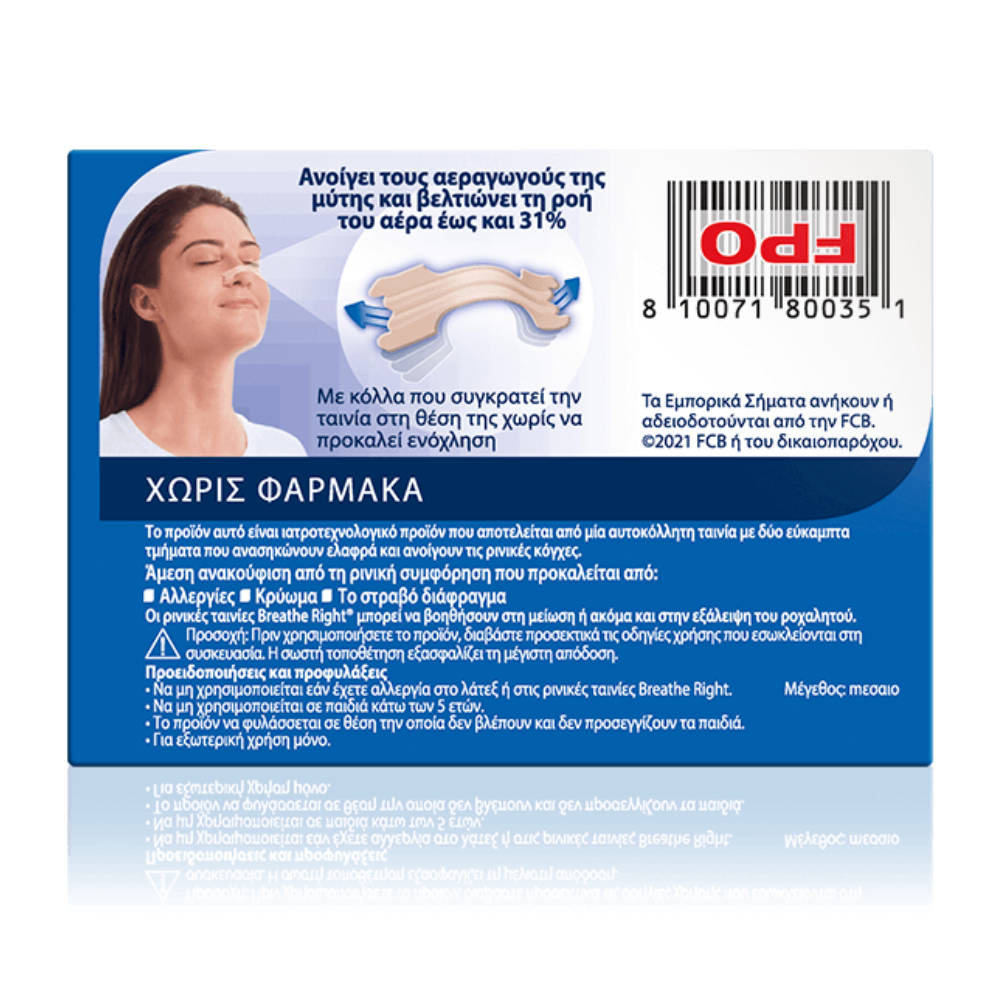 Οι ρινικές ταινίες Breathe Right® μπορούν να χρησιμοποιηθούν, ώστε να ανοίξει η μύτη σας για να εισπνέετε τον αέρα πιο εύκολα και να αναπνέετε καλύτερα, όταν υποφέρετε από ροχαλητό λόγω ρινικής συμφόρησης ή ρινική συμφόρηση που προκαλείται από κρυολόγημα ή αλλεργίες, κατά τη διάρκεια της άσκησης ή όταν απλά χαλαρώνετε.