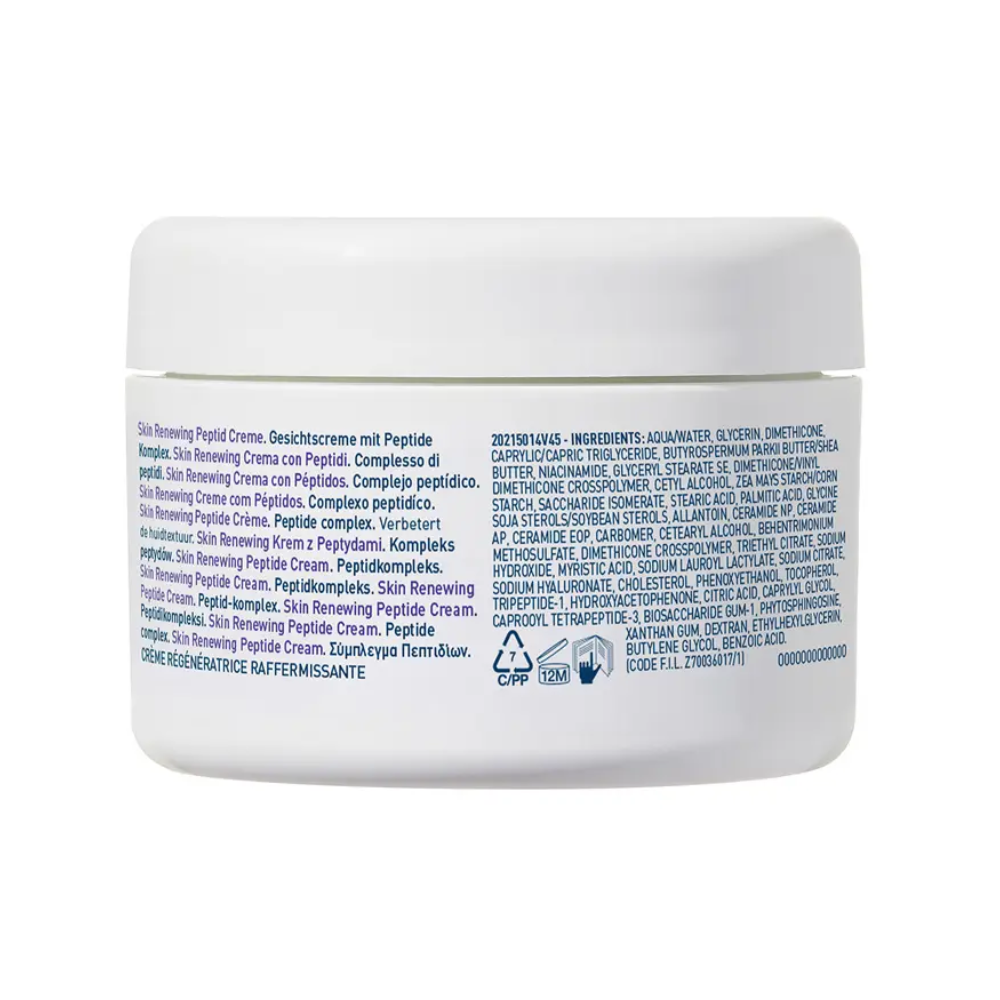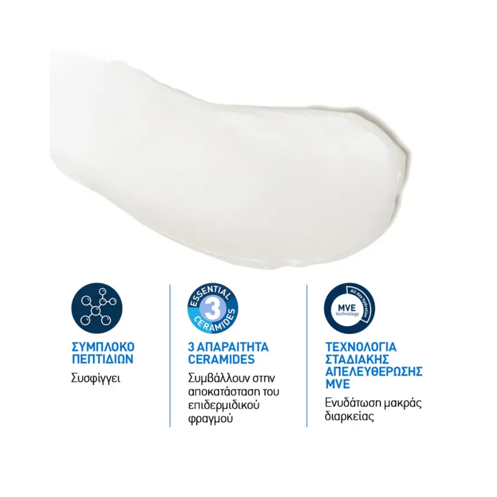 Κατάλληλη για όλους τους τύπους δέρματος, η CeraVe Skin Renewing Peptide Cream περιέχει ένα σύμπλοκο Πεπτιδίων, Υαλουρονικού Οξέος και 3 απαραίτητων Ceramides που δρουν συνεργιστικά «κλειδώνοντας» την πολύτιμη υγρασία στο δέρμα και διαφυλάσσοντας τον προστατευτικό φραγμό του.