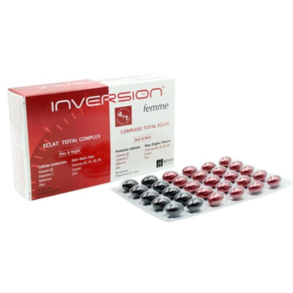 Το INVERSION Femme είναι ένα καινοτόμο συμπλήρωμα διατροφής, ειδικά μελετημένο για γυναίκες, με δημοσιευμένη κλινική έρευνα που αποδεικνύει την πολλαπλή ευεργετική του δράση σε ολόκληρο τον οργανισμό. Είναι πλούσιο σε κολλαγόνο, ελαστίνη και ασβέστιο θαλάσσιας προέλευσης. Περιέχει πολλά σημαντικά συστατικά όπως Ω 3-6 λιπαρά οξέα, εκχυλίσματα από πράσινο τσάι και σπόρους σταφυλιού, φυσικό β-καροτένιο και διάφορες άλλες αντιοξειδωτικές ουσίες, βιταμίνες και ιχνοστοιχεία που συνεργούν για ολοκληρωμένη αντιγήρανση σε δέρμα, μαλλιά, νύχια και καλλίγραμμη σιλουέτα.