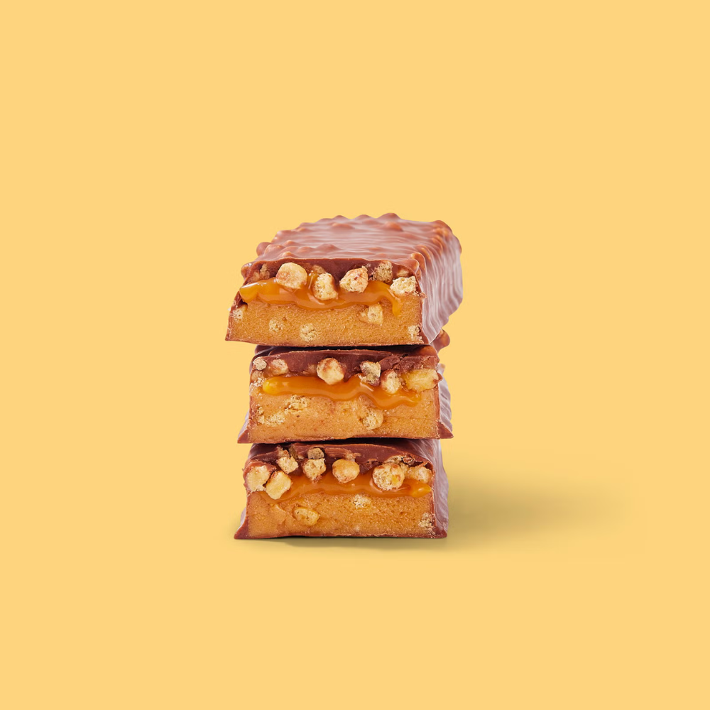 ΜΠΑΡΑ ΜΕ ΥΨΗΛΗ ΠΕΡΙΕΚΤΙΚΟΤΗΤΑ ΠΡΩΤΕΪΝΩΝ, ΣΤΡΩΣΗ ΜΕ ΓΕΥΣΗ ΚΑΡΑΜΕΛΑΣ (12%), ΜΕ ΕΠΙΣΤΡΩΣΗ ΣΟΚΟΛΑΤΑΣ ΓΑΛΑΚΤΟΣ (16%). ΓΕΥΣΗ ΚΑΡΑΜΕΛΑΣ ΚΑΙ ΞΗΡΩΝ ΚΑΡΠΩΝ, ΜΕ ΖΑΧΑΡΗ ΚΑΙ ΓΛΥΚΑΝΤΙΚΑ.
