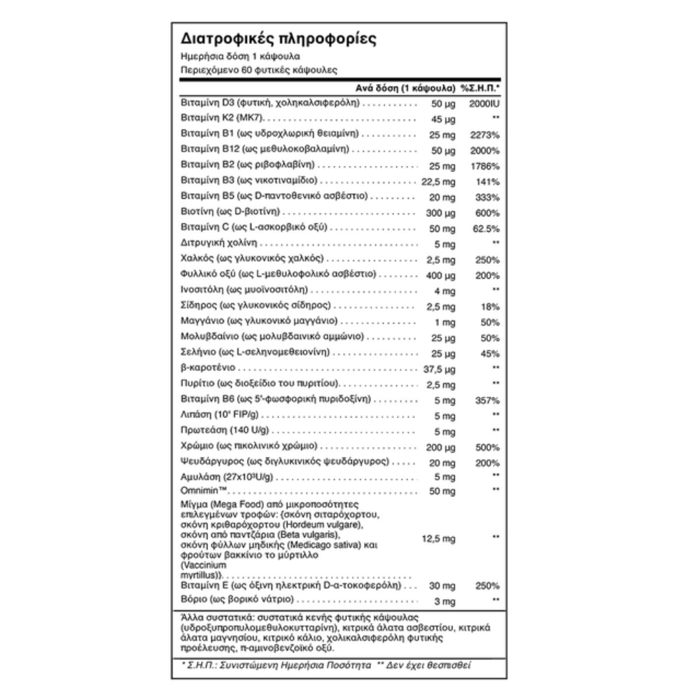 -Mίγμα (Mega Food) από μικροποσότητες επιλεγμένων τροφών: {σκόνη σιταρόχορτου, σκόνη κριθαρόχορτου (Hordeum vulgare), σκόνη από παντζάρια (Beta vulgaris), σκόνη φύλλων μηδικής (Medicago sativa) και φρούτων βακκίνιο το μύρτιλλο (Vaccinium myrtillus)} – 12,5 mg