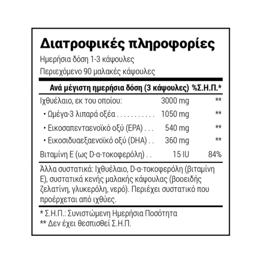 Συμπλήρωμα διατροφής με ωμέγα 3 από βιώσιμα αλιευμένους ιχθύες, με ισορροπημένη περιεκτικότητα σε EPA και DHA, που συμβάλλουν στη φυσιολογική λειτουργία της καρδιάς, του εγκεφάλου και της φυσιολογικής όρασης και φυσική βιταμίνη Ε, που συμβάλλει στην προστασία των κυττάρων από το οξειδωτικό στρες.