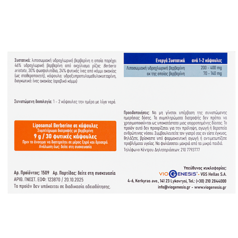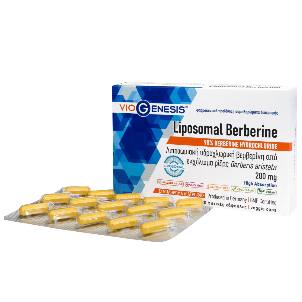Το VioGenesis Liposomal Berberine περιέχει 200 mg λιποσωμιακή υδροχλωρική βερβερίνη η οποία αποδίδει 70 mg βερβερίνη ανά κάψουλα, από το εκχύλισμα ρίζας Berberis aristata. Τα λιποσώματα απορροφώνται αποτελεσματικά από το έντερο και μπορούν να εισέλθουν απευθείας στα κύτταρα. Λόγω της αυξημένης απορρόφησης, απαιτείται μικρότερη ημερήσια δόση για να επιτευχθεί το ίδιο αποτέλεσμα, συγκριτικά με ένα συμπλήρωμα διατροφής με βερβερίνη σε μη λιποσωμιακή μορφή.