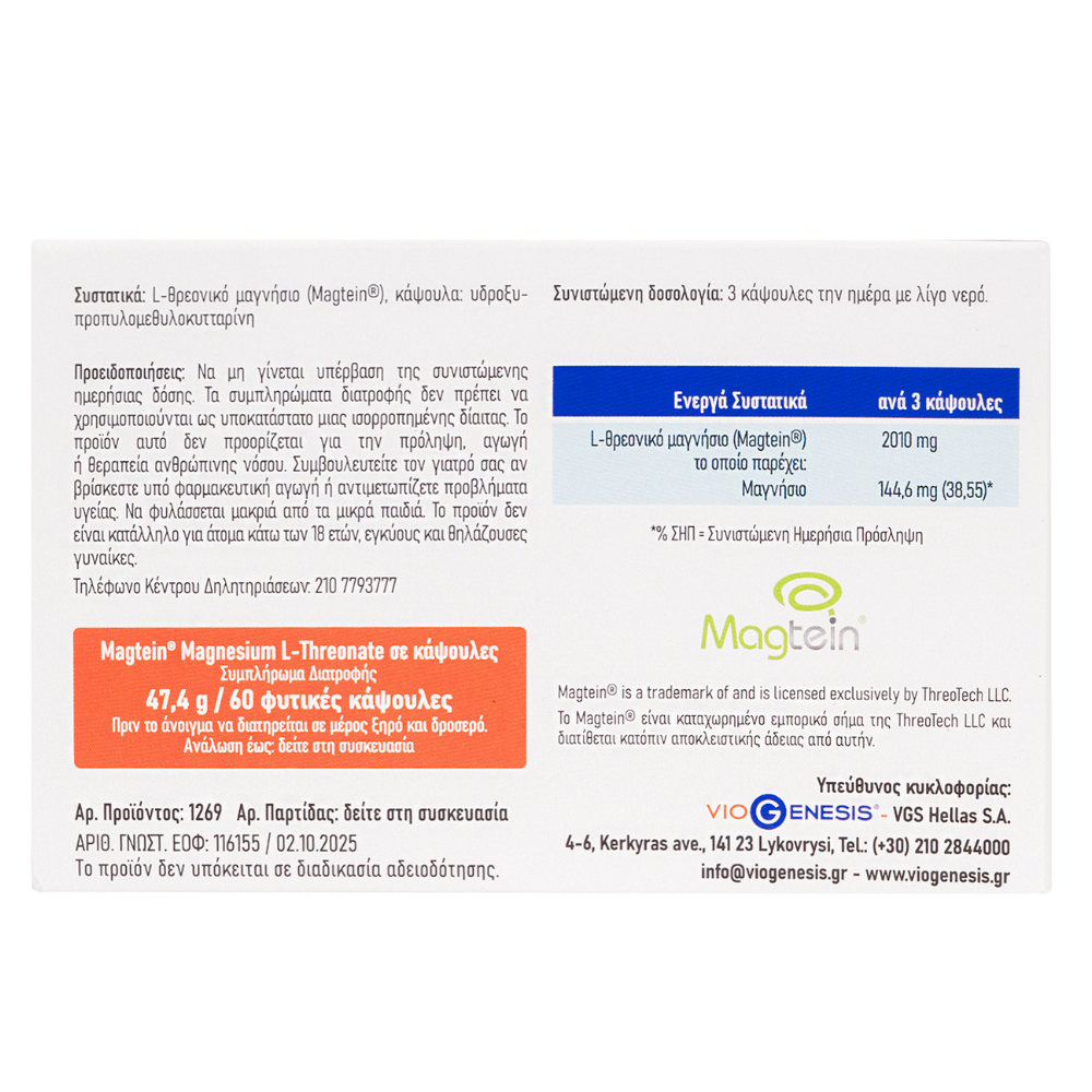 Το Viogenesis Magtein® Magnesium L-Threonate είναι ένα συμπλήρωμα διατροφής που περιέχει 2010 mg L-θρεονικό μαγνήσιο ανά δόση, τα οποία αποδίδουν 144,6 mg μαγνήσιο.