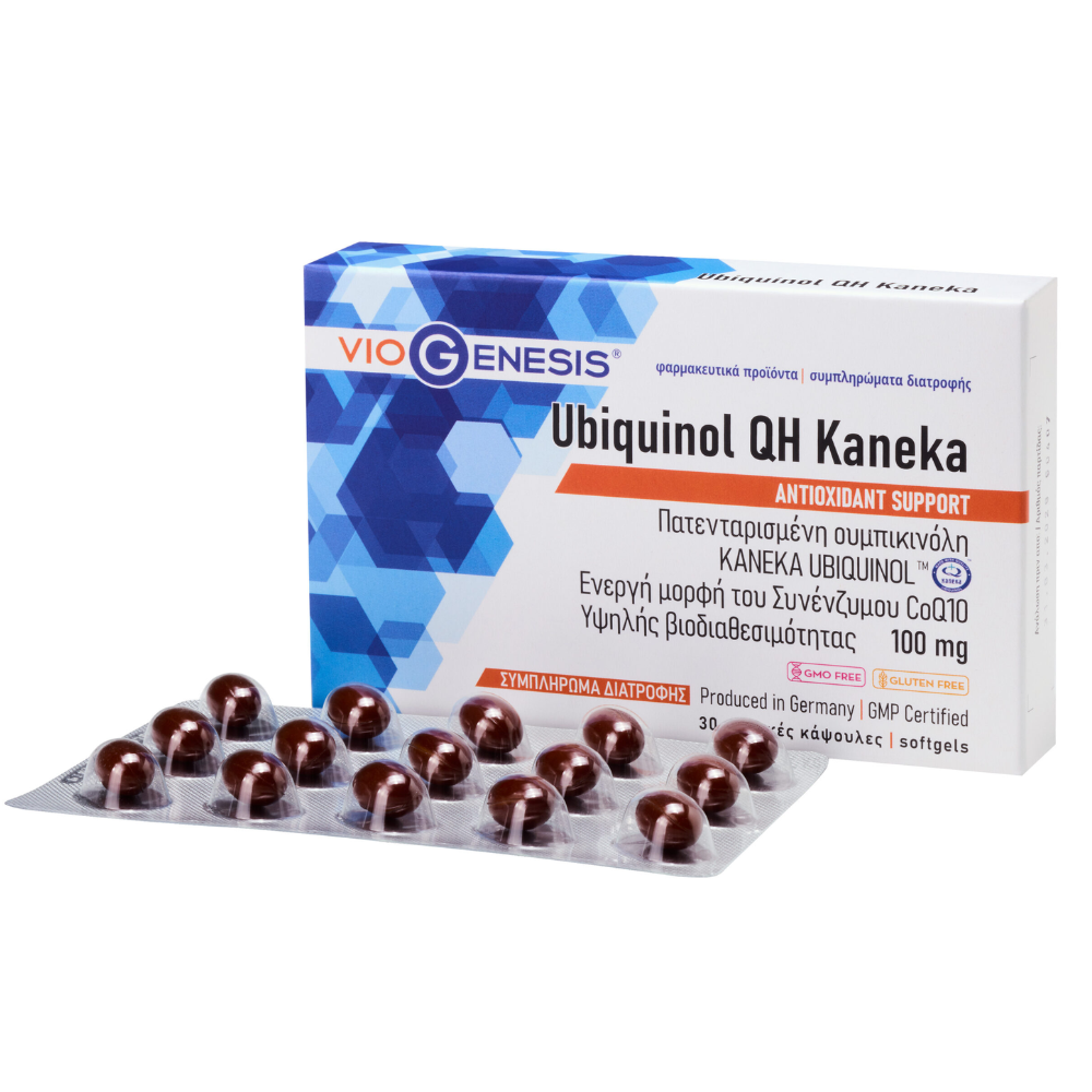 Το VioGenesis Ubiquinol QH Kaneka περιλαμβάνει άριστης ποιότητας πατενταρισμένη ουμπικινόλη (KANEKA UBIQUINOL™). H ουμπικινόλη αποτελεί την ανηγμένη (ενεργό) μορφή του συνενζύμου Q10 (ουμπικινόνη). Το συνένζυμο Q10 είναι μια ένωση που βρίσκεται στα μιτοχόνδρια των κυττάρων και συμβάλλει στην παραγωγή τριφωσφορικής αδενοσίνης (ATP), δηλαδή την παραγωγή ενέργειας. Συγκριτικά με το συνένζυµο Q10, η ουμπικινόλη παρουσιάζει αυξημένη απορροφητικότητα και βιοδιαθεσιμότητα. H ουμπικινόλη είναι ένας φορεάς ηλεκτρονίων µε ισχυρές αντιοξειδωτικές ιδιότητες, που παίζει σημαντικό ρόλο στην παραγωγή κυτταρικής ενέργειας στα μιτοχόνδρια.*